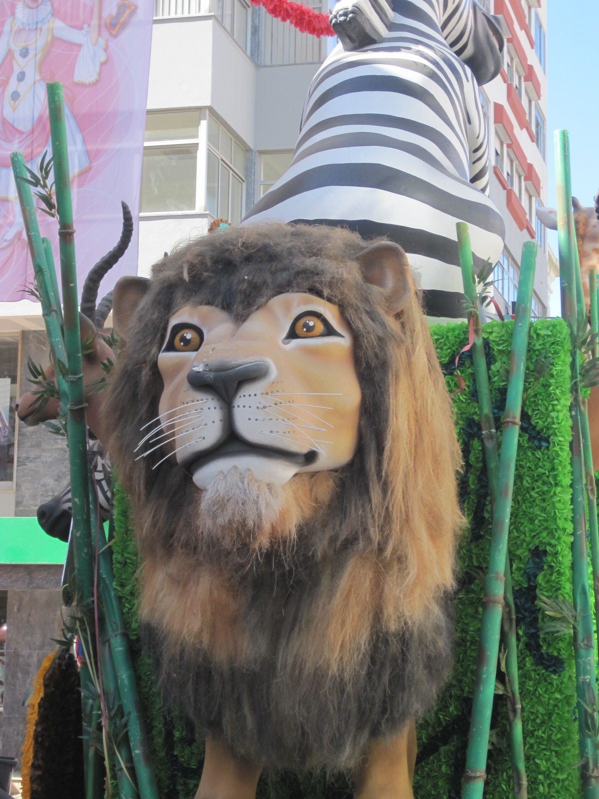 A pavement coffee and pastry to watch the excitement build was a good choice. The 15 floats were towed gently into place and there was plenty of time to wander between them to admire and take photographs without the crowd. Loudspeakers announced a 3pm start and it was time to seek out that good spot, having first paid your 2 euros at the kiosk. It was entertainment in its highest form just watching the locals arriving, many of the children in costume and jiggling with excitement. This year costume shops and stalls had been set up to encourage people to get into the spirit of Carnaval and shake off the doom and gloom.