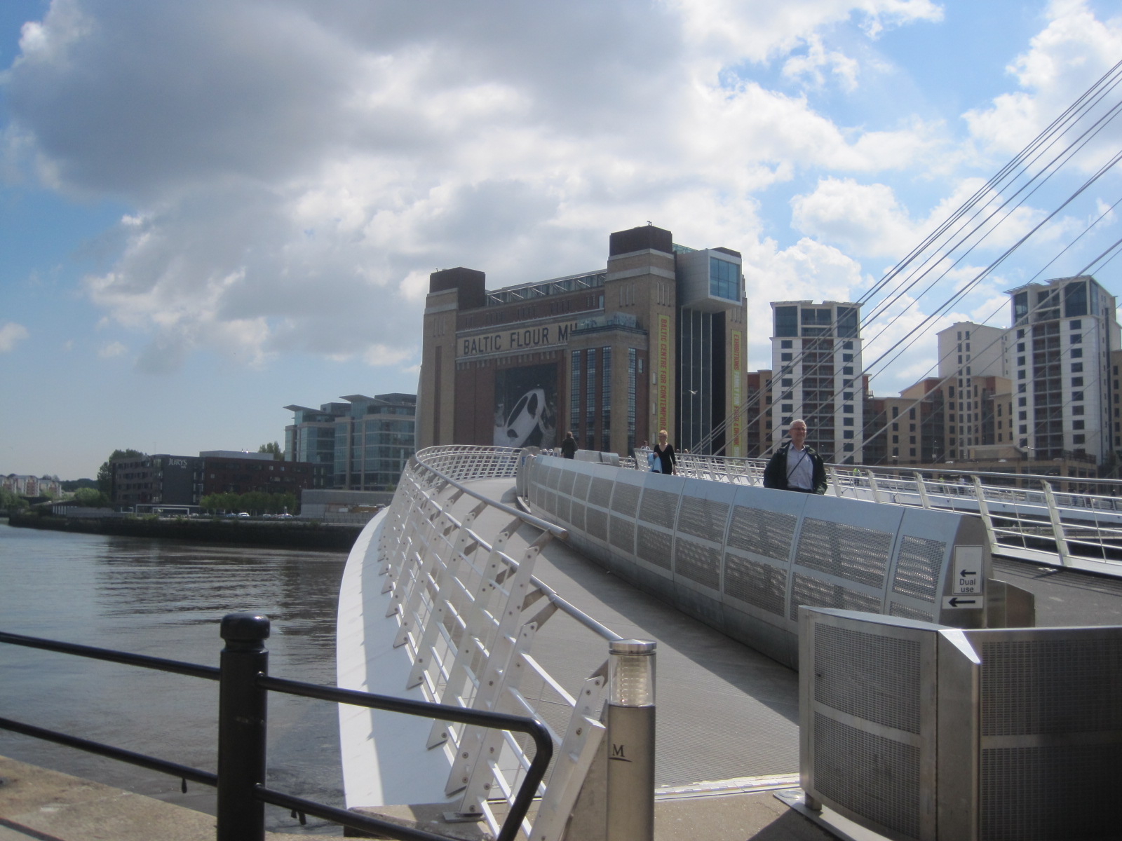 As the siren sounds people hurry to get off the bridge