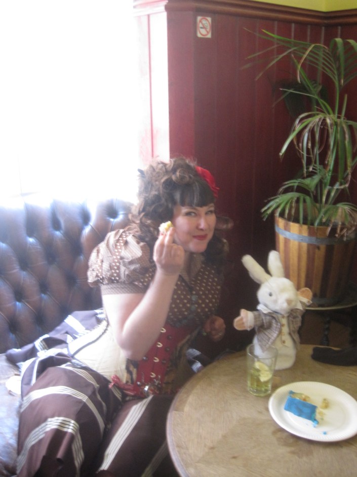Jema eating cake, accompanied by Mr. Woppit