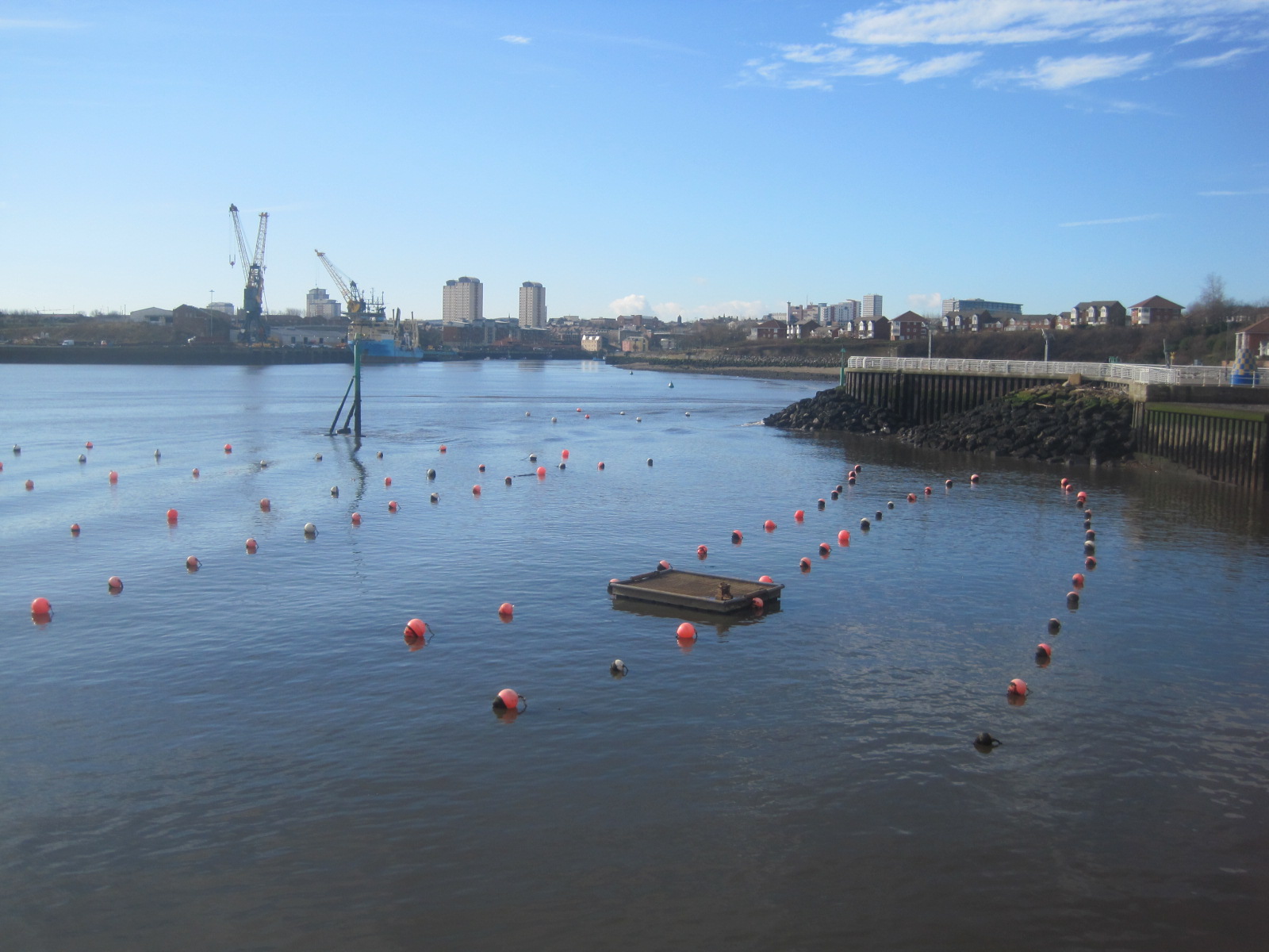 Tiny buoys dot the water as you look back to the Glass Centre