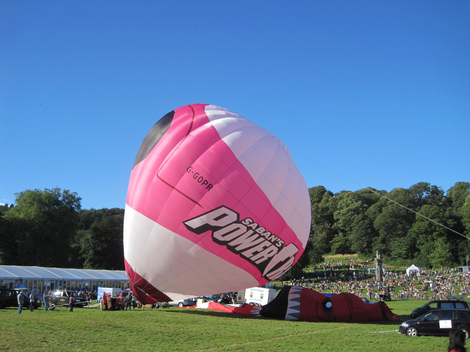 I had arrived at the showground early, and been royally entertained with flying model aircraft and the beautiful gardens at Ashton Court- all in radiant sunshine. But there was no doubt of the spectacle that everyone wanted to see, and excitement began to build as the teams drove out onto the field. The baskets were tipped inelegantly on their sides and the balloons draped around them.
