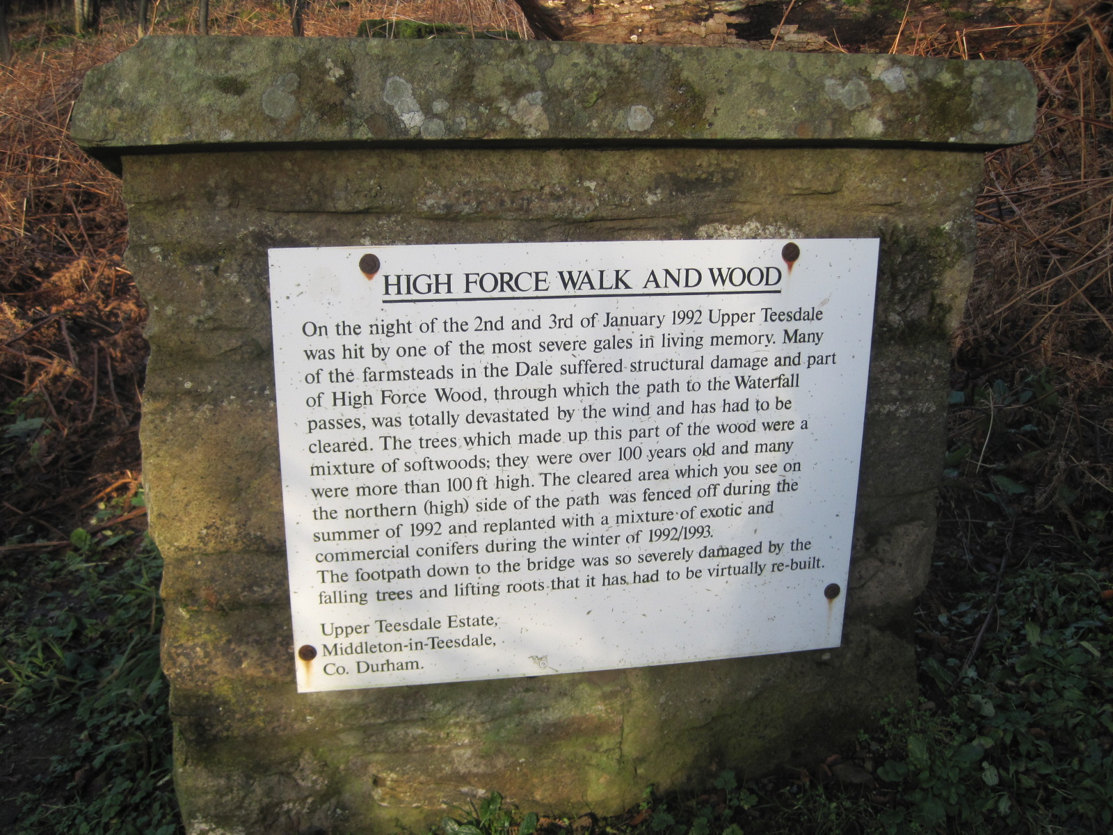 From the car parking at High Force, you can walk down to view the falls and then follow the river downstream to Low Force, pictured in my first photo. A sign at the top of the path grabbed my attention- a reminder that the power of nature is nothing new at all.
