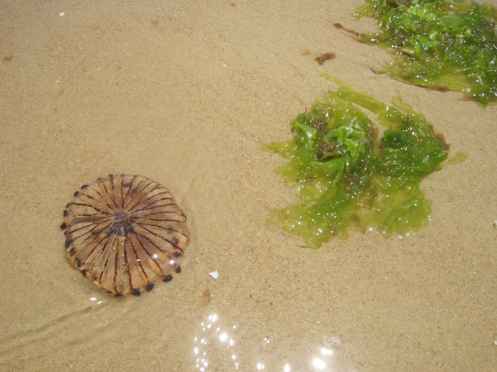 It was the first I’d seen. In April the beach was awash with jellyfish but this little guy was all alone with the seaweed. 😦