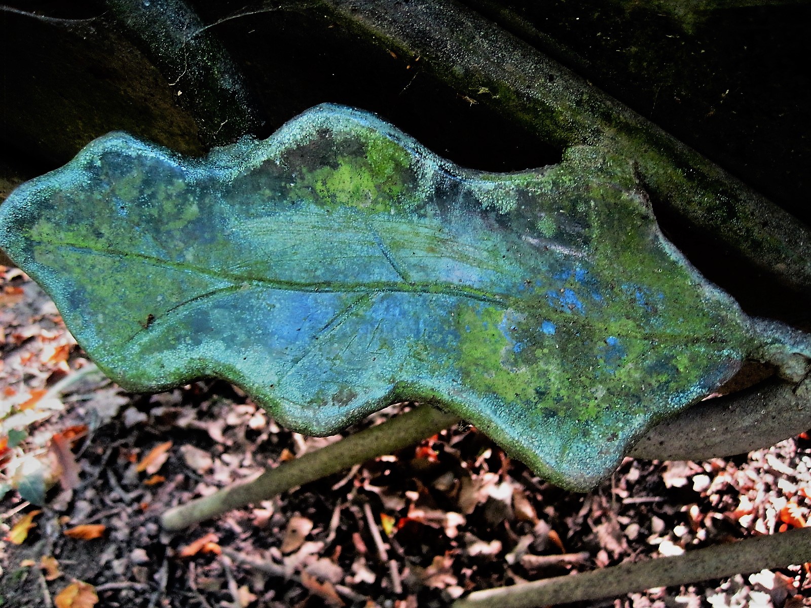 A sculpted leaf adorns a bench