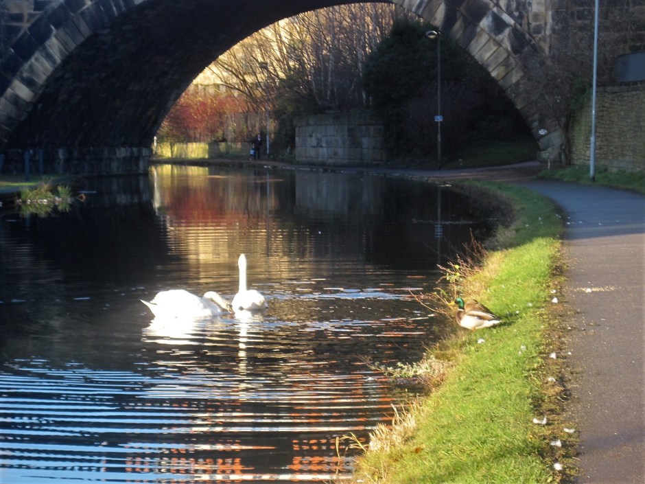 Remnants of once meaningful murals cling to tired brick walls. The water races headlong, a solitary swan seeming not to notice his drab surrounds.