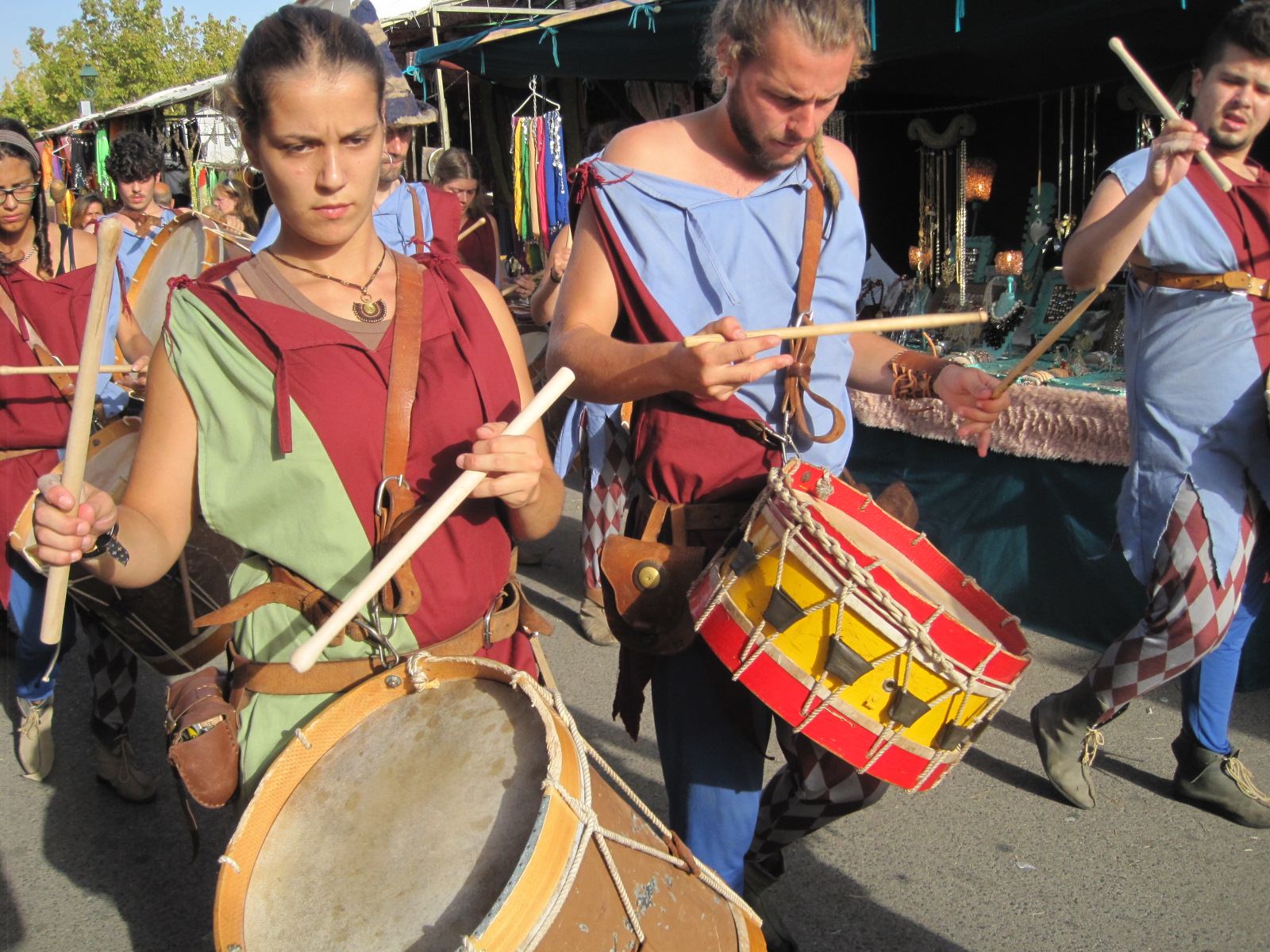 Interaction with the crowd is part of the fun, and stilt walkers stride menacingly around, while tumblers joke and totter through the streets, two of them frolicking with a large green ball. There is a menagerie of animals, from carefully controlled hawks to an endearing goose girl, from goats tugging at their leash to grouchy camels. You can’t help but be drawn in by the atmosphere.