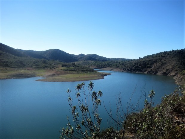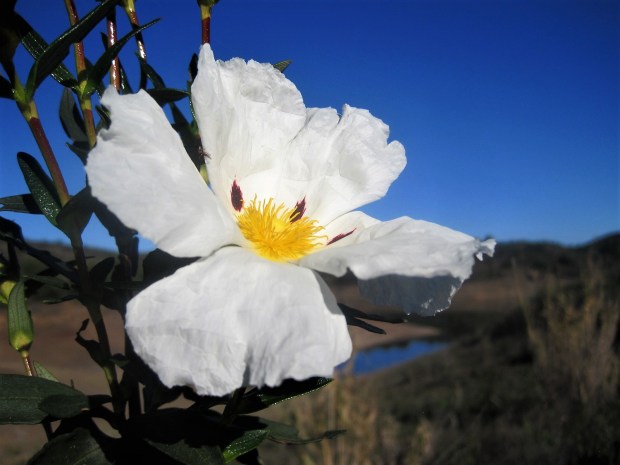 We left the village of Furnazhinas on a straightforward, if uphill, trail- PR10, Castro Marim. Efforts are made to maintain these trails and renew signs, but not always successfully. There has been so much growth with the damper than usual winter that a machete would have come in handy at one point. The cistus that I love for their beautiful flowers at this time of year are incredibly tenacious, clinging to our clothes as we tried to force a passage. A stream that we needed to cross didn’t help matters but, eventually, we found ourselves on firm ground. And undeniably beautiful.