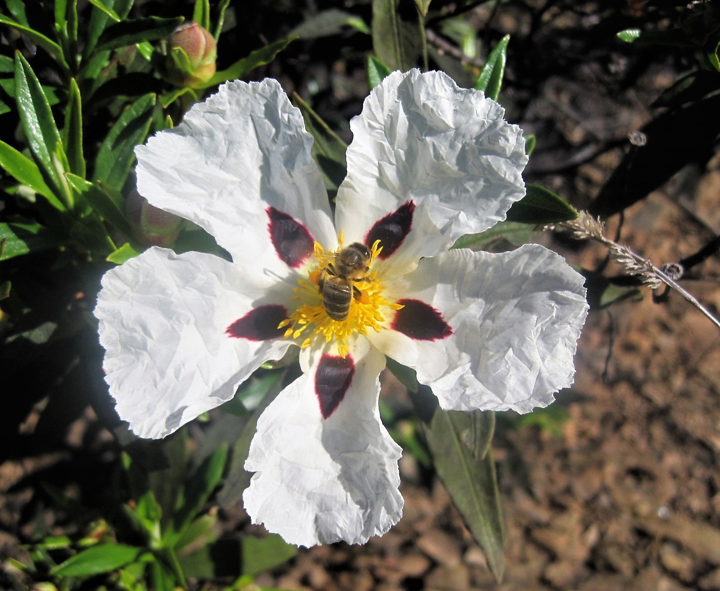 For a while the landscape opens out, and we catch our breath. The land has been left to fend for itself, thriving on the absence of human endeavour. Minute yellow and crimson flowers- more rock roses!- dot the trail, and I take great care not to trample them.