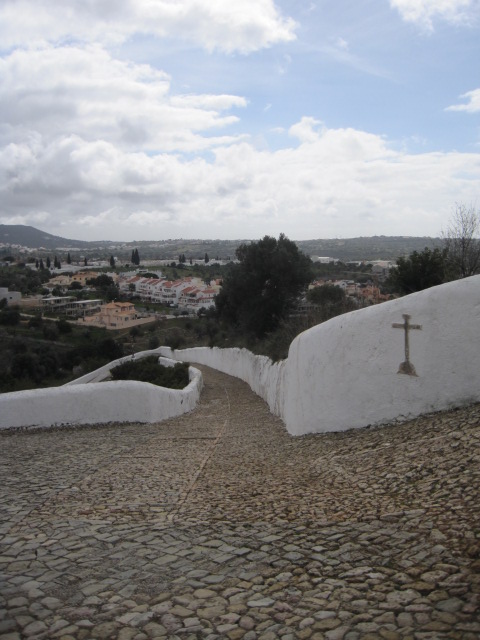 ‘A waterfall?’ I hear you say. ‘In the back streets of Loulé?’ Well, why not? If you believe in Santa… We just need to twist and turn a bit, head down this paved drive, a sharp left into a narrow alleyway and look! Steps lead steeply down. You can hear the sound of tumbling water. And there it is! Complete with stepping stones, maybe a touch precarious. We’ll just look, from here.